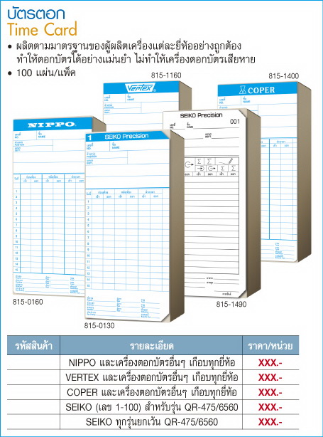 ProductID 0125012 สถานะสินค้า สินค้าหมดชั่วคราว บัตรตอกเวลา Seiko II (1-100), 100 แผ่น สำหรับ QR-475/6560 ราคาพิเศษสำหรับสมาชิกหรือติดต่อเรา Be the first to review this product ฿175.00 ราคาไม่รวมภาษี จำนวน/Quantity: แพ็ค Add to cart Email a friend Add to compare list Add to wishlist DetailsExisting reviews ผลิตตามมาตรฐานของผู้ผลิตเครื่องแต่ละยี่ห้ออย่างถูกต้อง ทำให้ตอกบัตรได้อย่างแม่นยำ ไม่ทำให้เครื่องตอกบัตรเสียหาย 100 แผ่น/แพ็ค ใช้กับ SEIKO (เลข 1-100) สำหรับรุ่น QR-475/6560 Be the first to review this product Customers who bought this item also bought ปากกาเคมี 2หัว ตราม้า น้ำเงิน ฿9.50 กาวช้างเคนจิ ขนาด 3 กรัม ฿20.00 สเต็ดเล่อร์ (Staedtler) ปากกาลูกลื่น 4272 สีแดง ฿4.25 ปากกาลูกลื่น เฟเบอร์คาสเทล (Faber Castell) 1423... ฿7.75 ปากกาลูกลื่น เฟเบอร์คาสเทล (Faber Castell) 1423... ฿7.75 ปากกาลูกลื่น เฟเบอร์คาสเทล (Faber Castell) 1444... ฿8.25 < >