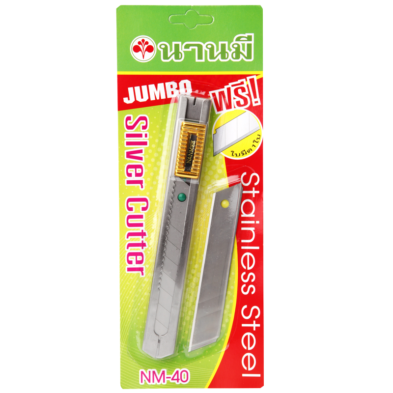 ProductID 0416001 สถานะสินค้า สินค้าพร้อมส่ง มีดคัตเตอร์เหล็กจัมโบ้+ใบมีด ตรานานมี NM-40 ราคาพิเศษสำหรับสมาชิกหรือติดต่อเรา Be the first to review this product ฿43.00 ราคาไม่รวมภาษี จำนวน/Quantity: อัน Add to cart Email a friend Add to compare list Add to wishlist DetailsExisting reviews ตัวด้ามผลิตจากเหล็กสเตนเลสอย่างดี ไม่เป็นสนิม ใบมีดมีความคม เหมาะกับงานตัดชิ้นใหญ่ จับกระชับมือ ใช้กับใบมีดขนาด 18 มม. มีใบมีดสำรองให้ 1 ใบ Be the first to review this product Customers who bought this item also bought ลวดเย็บกระดาษ MAX 10-1M ฿8.25 แฟ้มเจาะ 300 แกรม A4, ส้ม ฿8.50 ปากกา แลนเซอร์ 915 น้ำเงิน ฿5.00 ปากกาเคมี 2หัว ตราม้า น้ำเงิน ฿9.50 แฟ้มเจาะ 300 แกรม A4, เขียว ฿8.50 ลวดเสียบกระดาษกลมชุบ ตราม้า #1 ฿69.00 < >