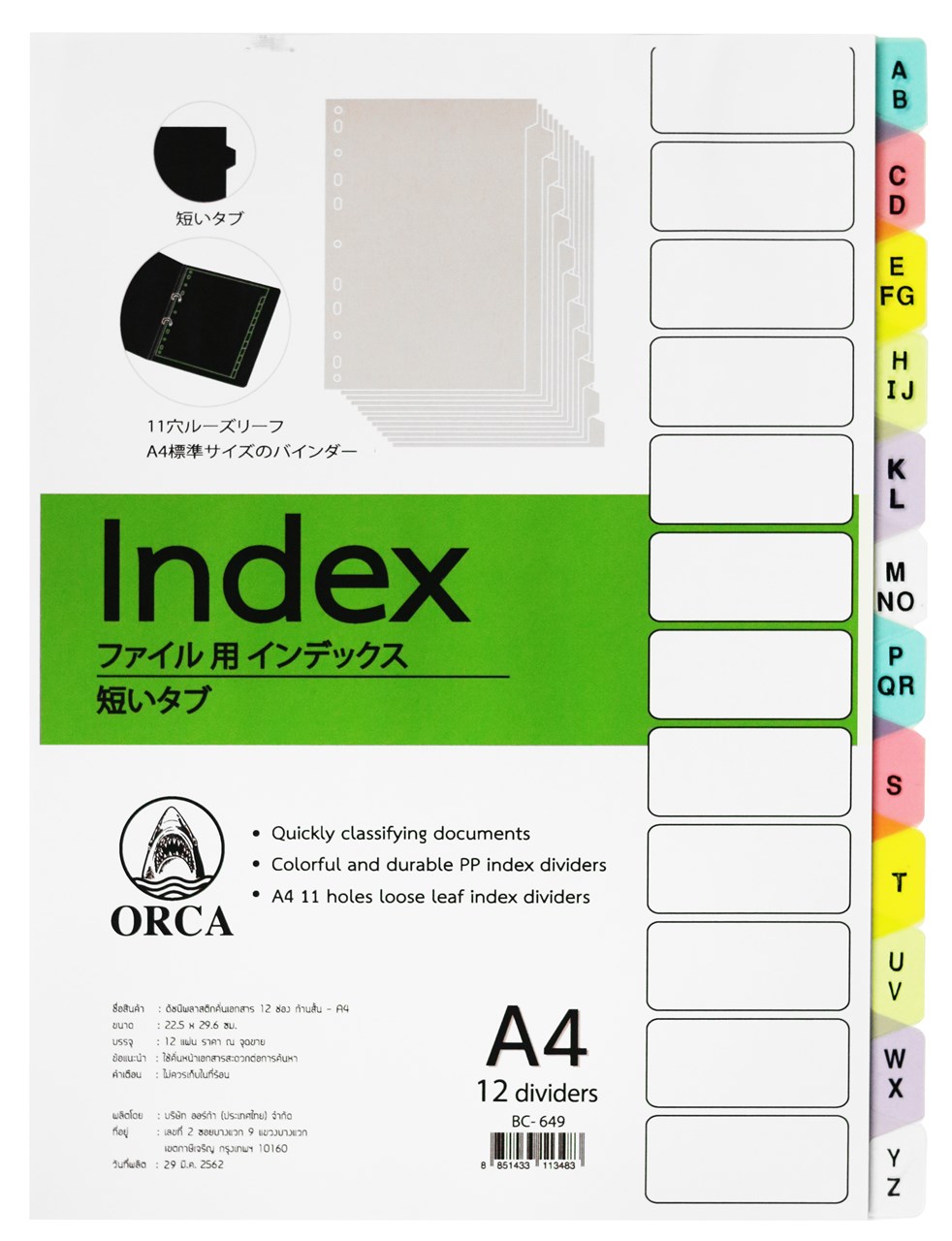 ProductID 0329090 สถานะสินค้า สินค้าพร้อมส่ง อินเด็กซ์พลาสติกใส ออร์ก้า, พิมพ์ A-Z 12ช่อง, BC-649 ราคาพิเศษสำหรับสมาชิกหรือติดต่อเรา Be the first to review this product ฿54.00 ราคาไม่รวมภาษี จำนวน/Quantity: ชุด Add to cart Email a friend Add to compare list Add to wishlist DetailsExisting reviews ผลิตจากพลาสติก PP คุณภาพดีทนทานกันน้ำได้ ด้านข้างมี 11 รูมาตรฐาน ใช้ได้กับแฟ้มทุกชนิด ช่วยจัดเก็บเอกสารให้เป็นระเบียบด้วยตัวอักษร A-Z สะดวกต่อการค้นหา คละสี ขนาด(22.3x29.7) A4 Be the first to review this product