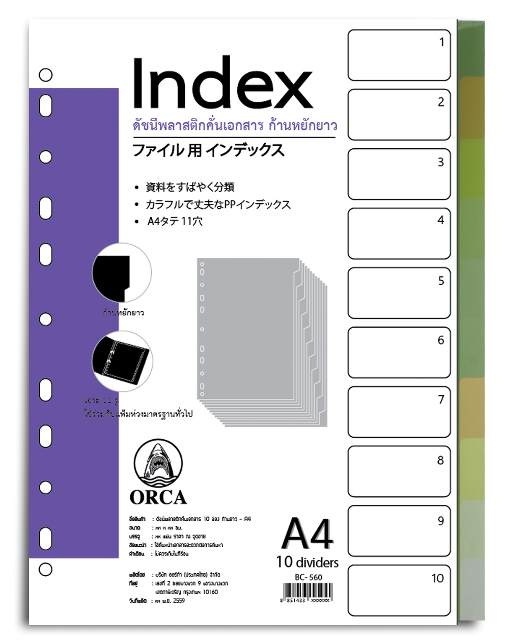 ProductID 0329097 สถานะสินค้า สินค้าพร้อมส่ง อินเด็กซ์พลาสติกใส ออร์ก้า,10ช่อง คละสี, BC-560 ราคาพิเศษสำหรับสมาชิกหรือติดต่อเรา Be the first to review this product ฿28.00 ราคาไม่รวมภาษี จำนวน/Quantity: ชุด Add to cart Email a friend Add to compare list Add to wishlist DetailsExisting reviews ผลิตจากพลาสติก PP คุณภาพดีทนทานกันน้ำได้ ด้านข้างมี 11 รูมาตรฐาน ใช้ได้กับแฟ้มทุกชนิด ช่วยจัดเก็บเอกสารให้เป็นระเบียบ สะดวกต่อการค้นหา คละสี ขนาด(22.3x29.7) A4 Be the first to review this product
